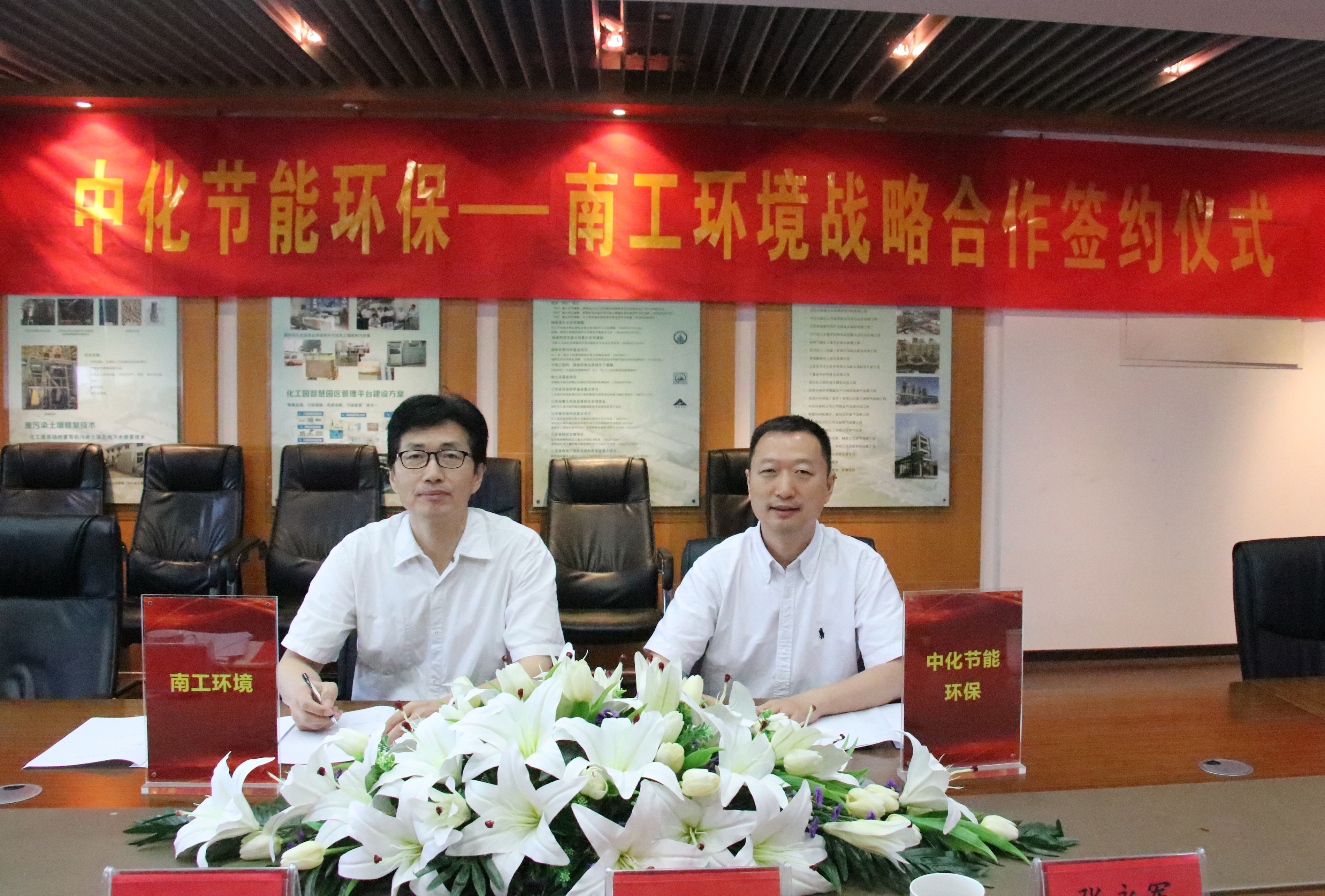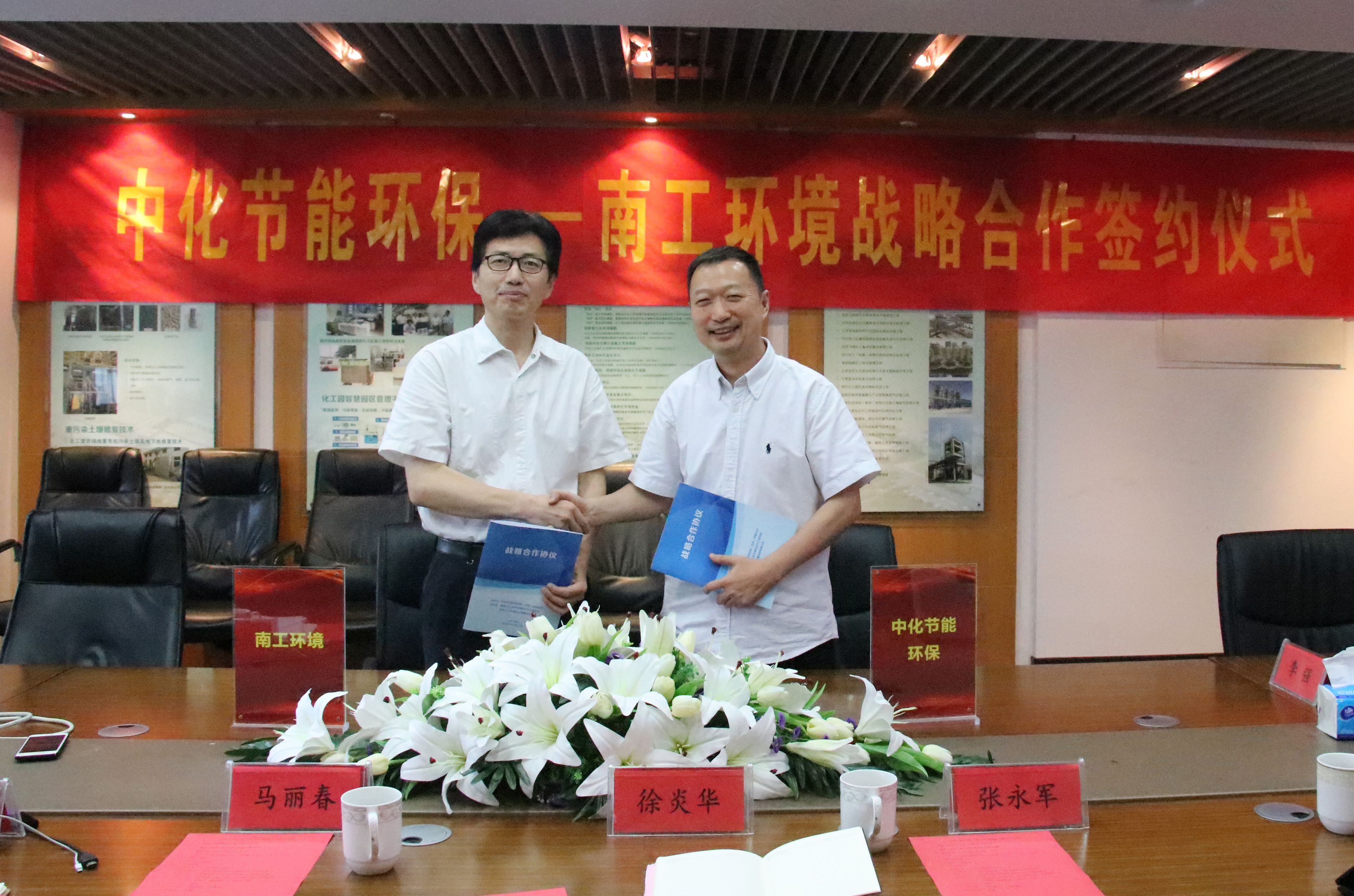 2018年8月30日,中化节能环保控股(北京)有限公司与南京工大环境科技有限公司战略合作签约仪式在南京举行。中化节能环保总工李强、南京工业大学环境科学与工程学院党委书记马丽春、院长徐炎华、副院长张永军、南京工大环境科技有限公司副总经理王金龙、技术总监李绚天共同参加签约仪式。