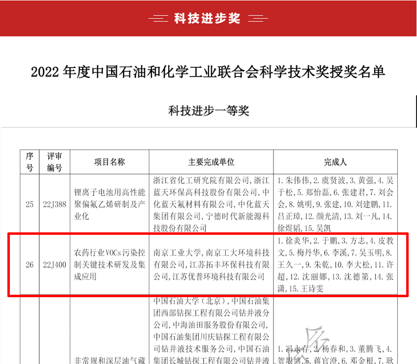 南京工大环境科技有限公司(“南工环境”,南京工业大学的高科技学科型公司)与南京工业大学等单位联合申报的“农药行业VOCs污染控制关键技术研发及集成应用”项目荣获中国石油和化学工业联合会“科技进步一等奖”。这是“南工环境”团队获得的第3项省部级科技进步一等奖。