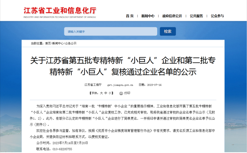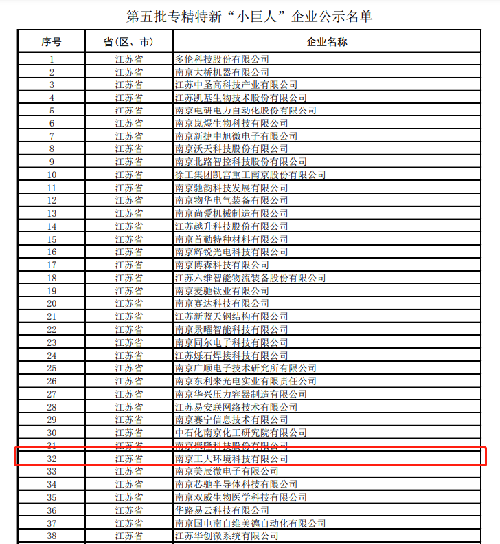 日前,江苏省工业和信息化厅发布通知,对江苏省第五批专精特新“小巨人”企业和第二批专精特新“小巨人”复核通过企业名单进行公告,其中江苏省第五批专精特新“小巨人”企业795家,第二批专精特新“小巨人”复核通过企业73家,南京工大环境科技有限公司(以下简称“南工环境”)榜上有名。